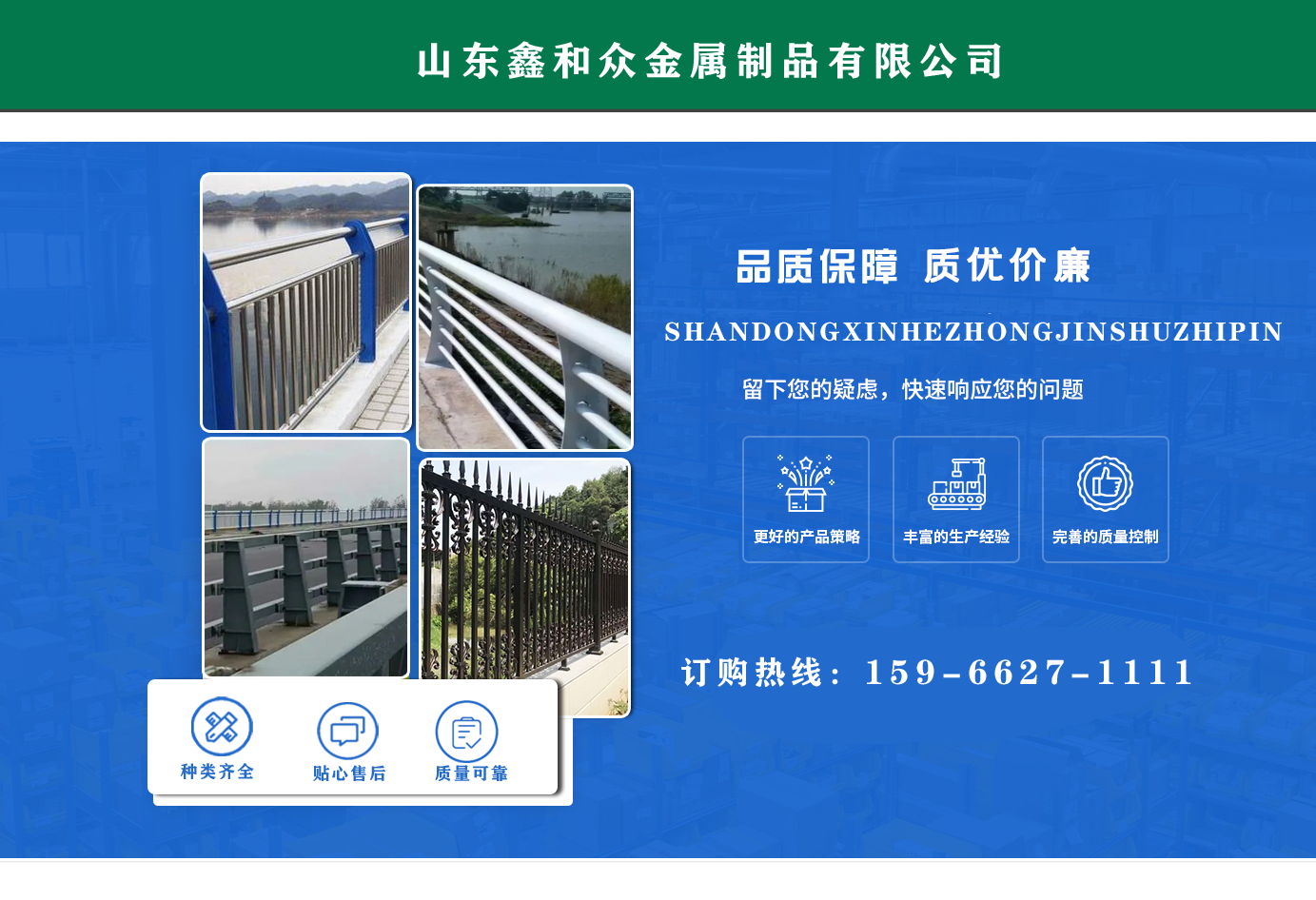 山東鑫和眾金屬制品有限公司主要產(chǎn)品有防撞護(hù)欄,橋梁護(hù)欄,道路護(hù)欄,河道護(hù)欄,不銹鋼護(hù)欄等護(hù)欄。提供設(shè)計方案,一站式定制,包您滿意價格優(yōu)惠,歡迎來電咨詢!    公司常年從事銷售護(hù)欄防撞護(hù)欄,橋梁護(hù)欄,道路護(hù)欄,河道護(hù)欄,不銹鋼護(hù)欄,橋梁鋼護(hù)欄,河道燈光護(hù)欄等。產(chǎn)品廣泛應(yīng)用于橋梁、河道、旅游景區(qū)、道路、公路、公園、小區(qū)、景觀、道路防撞等領(lǐng)域。    公司產(chǎn)品均采用優(yōu)質(zhì)不銹鋼材料,符合相關(guān)標(biāo)準(zhǔn)。各種型號不銹鋼復(fù)合管及護(hù)欄,質(zhì)量嚴(yán)格把控。產(chǎn)品強(qiáng)度高、耐腐蝕、焊接牢固、抗沖擊、性能好,防撞護(hù)欄結(jié)構(gòu)簡單、美觀實用大方。     歡迎前來訂購!...